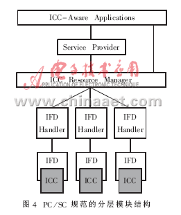 NC通信程序驻留于NC,它与读写器的通信程序通信。这个程序符合PC/SC规范。规范规定的分层模块结构见图4。