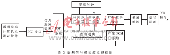 遥测信号模拟源由遥测前端计算机、数字信号处理器、数字副载波产生器、码同步产生器、低通滤波器和PCI接口等组成,其原理框图如图2所示。它采用直接数字频率合成器(DDS)作为数字副载波产生器、码同步产生器,通过数字信号处理器的控制和运算,产生相应的数字调制波,经PSK数字调制产生PSK信号。