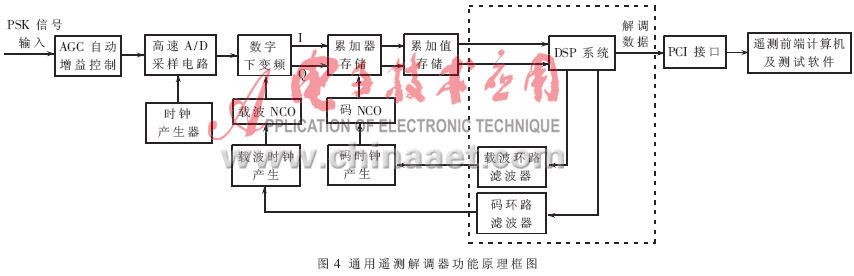 通用遥测解调器的原理框图如图4所示,其中时钟产生器、载波NCO、码NCO、码时钟产生、载波时钟产生、数字下变频器、相关累加器等均在FPGA中设计完成;载波环路滤波器" title="环路滤波器">环路滤波器、码环路滤波器、数据解调、位同步脉冲产生等均由DSP完成。