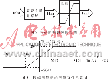 FFT实时谱分析系统采用的算术运算方案是定点运算" title="定点运算">定点运算,衰减限幅模块实现了定比例衰减、尾数处理和压缩信号电平的作用,用以防止数据溢出。模块框图如图2所示,其压缩特性如图3所示。