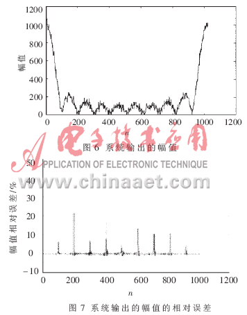 本FFT实时谱分析系统采用定点运算方案,输入为12位复数数据,输出为14位复数数据。采用方波信号进行测试,其参数为:脉冲幅度H=100,脉冲宽度M=10。本FFT实时谱分析系统输出的幅值如图6所示,输出的幅值的相对误差" title="相对误差">相对误差如图7所示。相对误差较大的一些点均出现在标准FFT输出的幅值很小的点上,这是由于有限字长效应引起相对误差造成的。同时由于采用的算术运算方案是定点运算,加剧了小信号的信噪比的恶化。但在实际应用中这些输出幅值很小的点会被判别为频谱上的噪声点,对实际的频谱分析影响不大,故对系统的误差影响并不大。而在标准FFT输出的幅值较大的点上,相对误差则很小。