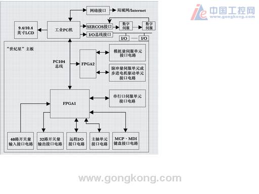 HNC-21/22的开关量接口电路,MCP、MDI键盘接口电路,进给轴接口电路,主轴接口电路都集成在一块“世纪星”主板上。其核心器件是ACTEL公司的FPGA晶片,为满足CNC装置对开放性的要求,“世纪星”主板采用双FPGA设计。一个FPGA晶片负责控制开关量接口电路,MCP、MDI键盘接口电路,主轴接口电路,串行口伺服驱动装置接口电路;另一个FPGA晶片负责控制脉冲量伺服驱动装置或步进电机驱动装置接口电路,模拟量伺服驱动装置接口电路。两个FPGA晶片通过PC104总线由研华工业PC机控制。利用FPGA晶片的灵活性,在不改变硬件电路的情况下,通过改变FPGA晶片的固件,以及两个FPGA晶片灵活搭配,构造出如下HNC-21/22“世纪星”系列CNC装置,从而最大限度地降低成本,提高性能。