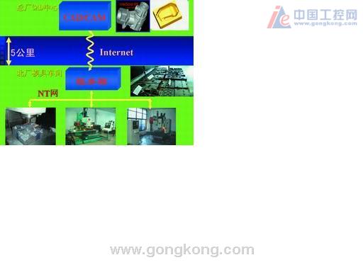 华中数控在某厂进行仿型铣数控改造时,对模具车间的2台加工中心、2台仿形铣和龙门铣实现了网络化互接,如图4所示。通过网络共用仿型数据,使普通数控铣床也能加工仿型测量的零件,提高仿型加工效率,节约了昂贵的仿形铣设备购置费用。同时,将工厂数控机床网络与办公用网络联在一起,使用办公室的CAD/CAM系统能方便快捷地与数控机床进行信息交换与控制,可在远程异地设计、编程,然后通过INTERNET网络传送和共享零件加工程序,实现了CAD/CAM/CNC的网络集成,大大提高了生产效率和设备的利用率。目前,这些设备运行状况良好,产生了重大经济效益。