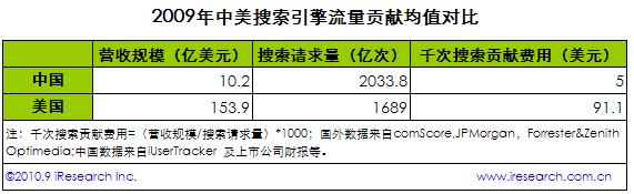 艾瑞以“千次搜索贡献费用”(即每千次搜索请求所贡献的营收额度)衡量搜索引擎的流量贡献均值,根据《2009-2010年中国搜索引擎行业发展报告》研究数据,2009年中国搜索引擎行业整体的千次搜索贡献费用为5.0美元,美国同类数据为91.1美元。由此,中国搜索引擎行业的流量贡献均值具备极大的提升空间。