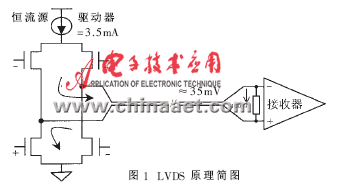 图1为LVDS的原理简图,其驱动器由一个恒流源(通常为3.5mA)驱动一对差分信号" title="差分信号">差分信号线组成。在接收端有一个高的直流输入阻抗(几乎不会消耗电流),所以几乎全部的驱动电流将流经100Ω的终端电阻在接收器输入端产生约350mV的电压。当驱动状态反转时,流经电阻的电流方向改变,于是在接收端产生一个有效的“0”或“1”逻辑状态。