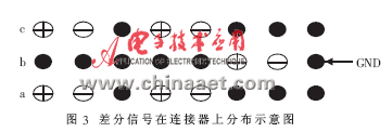应用中选择了双绞线平衡电缆,并在外层加屏蔽;接插件选择标准连接器,在连接器上差分信号通常连接在一行中靠近的两个连接脚上,示意如图3所示。