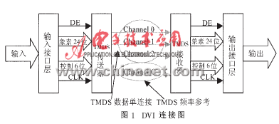 DVI接口传送的数据信号包括了一些象素信息、同步信息以及控制信息。信息分3个通道输出,同时还有一个通道用来传送使发送和接收端同步的时钟信号。每个通道中数据以差分信号方式传输,因此每一个通道需要2根传输线。具体连接方式如图1所示。
