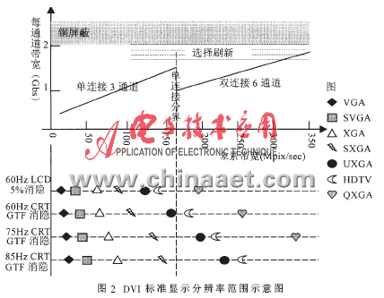DVI规范规定的数字图像分辨率范围如图2。对于75Hz的CRT来说,单连接最大为SXGA1280×1024,双连接最大为QXGA 2048×1536。所以单连接选择1024×768比较合适。但是单连接对于60Hz的LCD显示来说,最大上限为UXGA1600×1200、时钟最大上限为165MHz。色彩深度限制:因为DVI的图像传输默认为24bit,要得到更丰富的色彩,必须使用另一通道来扩展。因此在双通道应用色彩深度自然限制在24bit,控制数据为6bit。