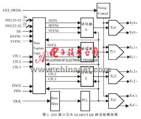 Silicon Image公司是DVI的发起人之一,有种类齐全的DVI接口芯片,其中发送芯片为SiI160CT100,接收芯片为SiI161BCT100。所有的发送和接收芯片都有两套象素端口,这样不仅可以在TMDS通道级实现双屏幕显示,同时还可以在象素级实现双屏幕显示。大致的芯片功能模块组成如图3所示。