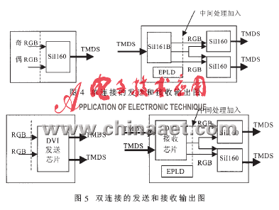 因此在复用HSYNC、VSYNC两个控制信号的复用选择级别上,如果选择在TMDS传输线对上,虽然有硬件实现逻辑简单的优点,但却既找不到现成的芯片,又无法实现热插拔" title="热插拔">热插拔识别功能。经过比较选择在信号接收后做两路驱动处理。如此频率也不是很高,而且全部是数字信号,可以灵活地用EPLD实现,同时还可以实现热插拔识别问题,绕过双连接时单连接禁止功能(双连接系统虽然可以在单、双连接中灵活切换。但是如果其驱动的是单连接监视器,另外一个连接被禁止);实现双连接驱动时,单连接和双连接之间自由切换。