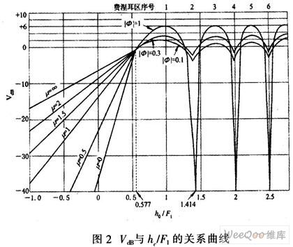 从以上计算过程可知,衰落因子V与相对余隙HC/F1有关。如图2所示,当hc/F1=0.577时,V=1,VdB=0 dB,收信场强E=E0,此时余隙具有特殊意义,记为h0=0.577F1称为自由空间余隙。当hc/F1<0.577时,发生绕射衰落较大;随着余隙增大,反射点处于第一菲涅尔区,反射信号与直射信号同相相加,使衰落因子出现正值;当余隙增大到一定程度时,反射点进入第二菲涅尔区内,反射信号与直射信号反相,衰落因子急剧下降,甚至会造成信号中断。