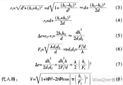 由式(1)可见,微波传播过程中树林、建筑、山头或地面障碍物等会阻挡一部分电磁波,增加损耗。而平滑地面或水面可将一部分信号反射到接收天线,反射波和直射波矢量相加可能相互抵消而产生附加损耗。地面反射对视距传播有重要影响,它是产生电平衰落的主要原因之一。但当微波传输路径上有刀刃形障碍物(或山峰)阻挡时,如果障碍物的尖峰恰好落在两个相邻微波站的收信天线和发信天线的连线上,微波传输会增加6 dB电平衰耗;当障碍物的尖峰超出连线时,电平衰耗将增加更快,实际应用中应避免出现这种情况,可通过改动微波传输线路或增高天线来改动传输特性。为更好的分析微波的传播特性,应用菲涅尔区的概念进行分析,则从波源到观察点的电波可认为是通过许多菲涅尔区传播的,且在观察点的合成场强E≈E1/2(E1为第一菲涅尔区的场强),即只要保证第一菲涅尔区的一半不被地形地物遮挡.就可近似得到自由空间传播时的场强。若要知道阻挡物多高才能满足传播条件,必须计算第一菲涅尔区的半径F1单位为m,计算方法为: