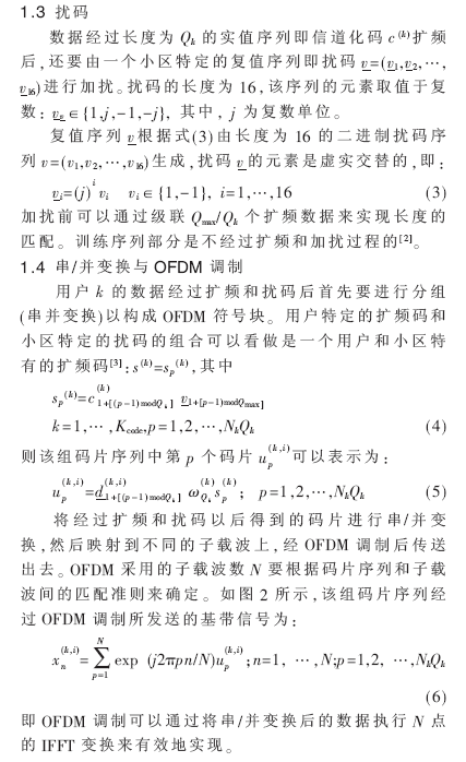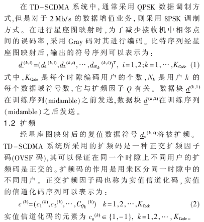在TD-SCDMA系统中,为了保证数据在无线链路上的可靠传输,物理层首先需要对来自媒体接入层(MAC层)和高层的数据流进行编码和调制,然后经过物理信道映射之后,对其进行扩频和扰码处理。扩频处理是采用具有码片速率的数字序列与信道数据相乘(直积),扩展了信号的带宽,将具有比特速率的数据流扩成具有码片速率的数据流。扰码处理是用一组数字序列与扩频后的数据相乘(点乘),并没有改变数据的传输速率。扩频的目的是扩展带宽,扰码的目的是区分用户[1]。