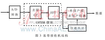 接收端执行与发射端相逆的过程,对接收到的信号进行符号定时同步、串并变换和去除CP,然后根据估计出的频率偏移进行频率校正,并执行N点的FFT变换,以实现OFDM解调。同时采用一定的信道估计算法估算出OFDM各个子载波上的信道系数。可以用带有midamble码的OFDM符号作为导频符号来执行信道估计。然后对OFDM解调后的信号执行单用户或多用户检测,以判决出发送的数据。基带接收机结构如图3所示。
