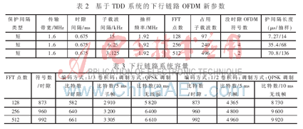 从表1中可以看出:根据不同的传输速率需要,可以使用长、短两种不同保护间隔;1个675 ?滋s的时隙可以支持9个使用短保护间隔的OFDM符号,或者8个使用长保护间隔的OFDM符号;按照3GPP长期演进计划的要求,系统应该具有尽可能大的吞吐量和良好的性能。但是通过对该组帧结构参数的分析可以发现,系统容量还有很大的提高余地。