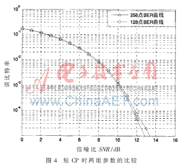 但是,N增加,计算复杂度就会变大,并且在消除符号间干扰和信道间干扰方面也带来了一定的麻烦,在实际的设计过程中选择N=128或N=256。以短保护间隔为例进行性能仿真时,N=256的性能略好于N=128的性能,但是以长保护间隔为例进行性能仿真时,N=256的性能略差于N=128的性能,因为对于长保护间隔而言,N=256时子载波间隔相对较窄,受到多普勒频移的影响较大,但其较长的保护间隔又可以改善一定性能。