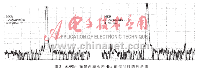 DDS技术以其极高的频率分辨率、极短的频率转换时间、输出信号相位连续等特点而得到广泛应用。本设计中使用AD公司的DDS芯片AD9834,其内部包含相位累加器、编程寄存器、串行I/O接口、正弦查询表、D/A变换器等。AD9834频率控制字为28位,5MHz系统时钟时频率分辨率为0.0186Hz,3V电源电压供电时功耗为20mW。AD9834提供低功耗模式,由TB4的输出信号进行控制。MSP430F449通过串行I/O口控制双路DDS输出频率和相对相位。MSP430F449控制两路频率分别为1.000119MHz和1.000123MHz的AD9834输出信号时频谱如图3所示。