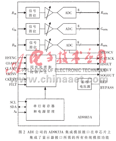 虽然人们对新出现的数字平面显示器接口的兴趣还在持续增长,但是分量模拟视频接口仍然是目前市场上销售的高级电视主要选择的高质量接口。许多高级电视还包含一个模拟视频图形适配器(VGA)接口以便与PC应用兼容。集成的分量模拟接口,例如美国模拟器件公司(ADI)的AD9883A,已经在单芯片上集成了显示器接口所需要的所有传统模拟功能(见图2 )。这种显示器接口集成的第一步已经起到降低成本、改进图像质量并且简化PCB布线的作用。