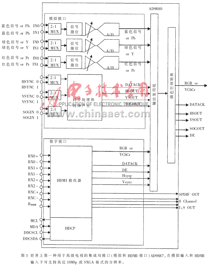 AD9887 是世界上第一种用于高级电视的集成双接口(见图3 )。其中模拟接口是基于AD9883A模拟接口设计的,以高达150MHz工作带宽用于1080p和SXGA显示分辨率。其中数字接口使用HDMI也能提供高达1080p和SXGA(150 Mbps)的图像分辨率。这两种接口共用相同的输出信号,因此与双芯片的模拟接口和数字接口设计相比节省了48 个引脚。这种芯片还提供该接口连接到显示器的自动检测,以及允许用户在一条串行数据线上连接该接口的选择。