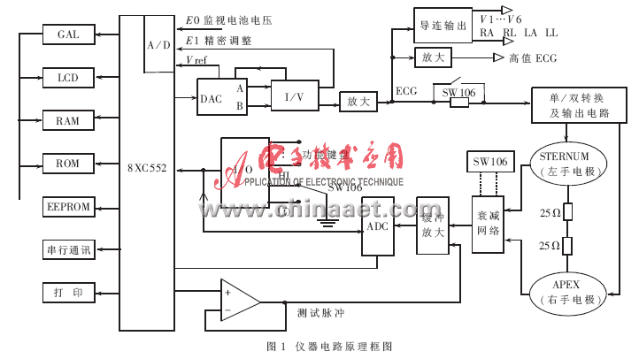 本仪器以飞利浦单片机80C552为控制核心,完成对除颤器各项功能的测试分析,并通过接口电路对分析结果进行显示和传输,原理框图如图1所示。除颤器测试分析仪主要完成两部分功能:(1)完成对除颤器放电能量的准确测量;(2)准确、稳定地输出各种心电波形及测试波形。为检验除颤器的自动除颤功能及其特性参数,要求分析仪能输出多种波形,包括具有多种导联输出的ECG(心电图)波且幅值可调,同时输出高幅值ECG信号、直流脉冲、方波、三角波、复合波、多种频率的正弦波以及多种心律的标准R波。各种波形的输出通过数字合成,由程序产生的波形经D/A转换器输出,然后通过模拟电路变换成所要求的输出模式。放电能量的检测是基于除颤器的高压放电脉冲通过模拟人体阻抗的模拟电阻(典型阻值为50Ω)放电,经衰减后送入可变增益放大器,变为A/D转换器的输入信号,然后进行处理和显示。