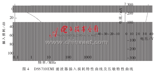 针对模拟信号的抗干扰,也采用同类EMI滤波器,只是在选择截止频率时保证大于信号的带宽。考虑由近场对公共线路所带来的冲击浪涌干扰,选用带铁氧体磁珠的三引线圆片压敏—电容器型EMI滤波器DSS710系列,图4为其对电磁干扰的抑制特性和压敏特性。压敏电压22V,电容量可达22000pF,加上铁氧体磁珠的作用,其对电磁干扰的抑制频率可以降低到3MHz以上,衰减大于20dB,且抑制频率范围明显展宽。此类滤波器用于系统各种电源通道中。