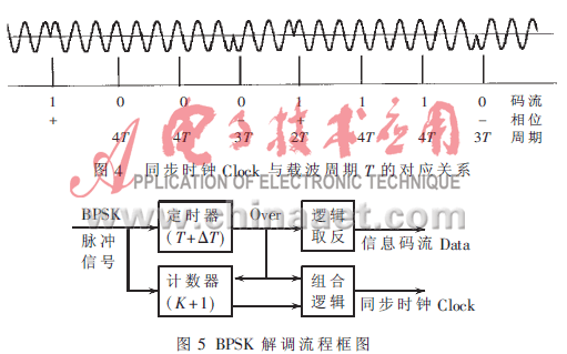 下面讨论如何生成数据的同步时钟。在上述解调过程中,如果相邻数据电平发生了翻转,即可从该解调数据得到一个同步时钟沿;而当相邻数据没有翻转时,是无法直接生成相应的时钟跳变的。图4所示是一串比较长的BPSK脉冲序列,其中每个码元对应的载波周期数为K(为简便起见,图4中每个码元对应的载波周期数仍为3)。由图4可见,如前后两个码元值有变化,从上一个码元结束到下一个码元开始,中间持续的时间可能为K-1个或者K个载波周期;如果前后两个码元值没有变化,那么一个码元的持续时间可用K+1个载波周期表示。根据上述特点,如果在解调流程中再设置一个值为K+1的计数器,根据以上对T、K两个参数的研究,信息码流的解调用一个定时器即可实现;如需要同时得到同步时钟,则必须结合定时器和计数器实现,如图5。