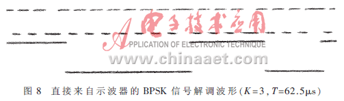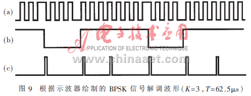 由简单计算可知,如果AT89C2051采用12MHz晶振,该验证方案能够解调的BPSK信号的最大载频约为25kHz。图8给出了从示波器上输出的解调波形图。实验中,BPSK模拟信号由信号发生器产生,信号载频为16kHz,对应T=62.5μs;为了能在示波器上看清各路信号的对应关系,采取了较大的二进制码流速率,这里取5.33kbps,对应K=3。