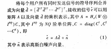 论文的第二部分给出了系统的模型,第三部分介绍了分块联合检测迫零算法(ZF)以及均方误差最小化(MMSE)算法,第四部分是仿真的结果,第五部分是结论。在本文中,上标H表示共轭转置,上标T表示转置。 二、系统模型