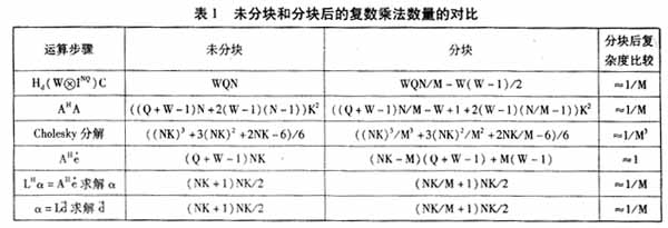 在分块联合检测算法中,信道冲激响应矩阵被划分成了大小相同的方阵。对于复杂度较高的矩阵相乘以及Cholesky分解、回代等运算只需在较小的矩阵上进行,同时由于分块后每个子块矩阵都是一样的,这些操作只需进行一次即可,所以复杂度能够明显降低。表1中列出了未分块和分块后的复数乘法数量的对比。在运算量较大的Cholesky分解部分,分块之后的运算复杂度下降为原来的1/M3。由于接收信号分块后每块数据不同,需要单独运算,所以AH部分分块前后运算量没有变化,除上述两步其他运算步骤的运算量均下降为未分块的1/M。