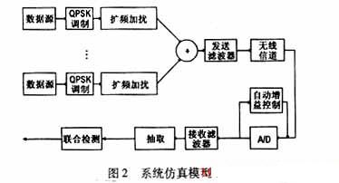 仿真环境建立在C语言的基础上,基站天线数目为8,用户数目为10,扩频系数为16,联合检测算法采用迫零(ZF)算法。信道模型采取标准中的固定延时[7],信道衰落采用瑞利衰落模型[6]并且加上高斯分布的白噪声。仿真模型如图2所示。