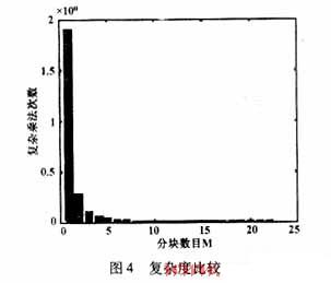 图3是仿真的结果,未分块以及不同的分块数目的情况都已经过仿真。矩阵分块数目越多,由于系统简化带来的ISI和MAI对系统的影响越明显,从而系统性能随之下降。从图4中可以知道系统运算复杂度随着矩阵分块数目增多而明显下降。以分块数目为2为例,与未分块相比,系统性能约有3 dB的下降,而运算复杂度降低了约8倍。分块数目M的选取应该满足如下规则:用户发送每个数据段长度N是M的整数倍。这是考虑到进行分块联合检测算法中,用户k输出的数据
