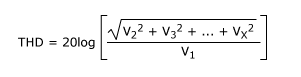 总谐波失真(THD):出现在输入(DAC为输出)频率整数倍频点(谐波)的失真的RMS值与输入(或输出)正弦波的RMS值之比。测量中仅包括奈奎斯特频限内的谐波,典型值以分贝表示: