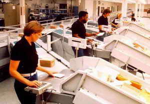 在归类站中,邮件投入传送带,编码接收器或操作人员读取邮政编码。此后,邮件交由机器处理。控制系统根据邮政编码决定目的站,标明去向。