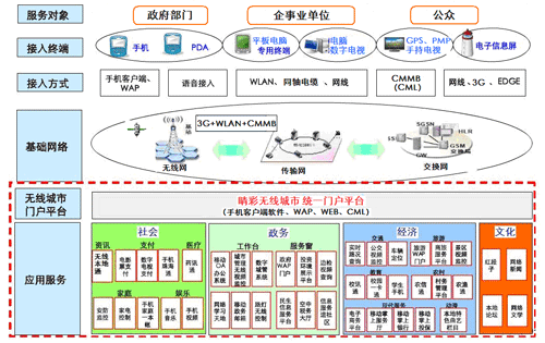 事实上,无线城市的定义是有广义和狭义之分的:狭义的定义来自实践经验,主要是指“无线宽带城市”,利用WiFi、WiMAX再加Mesh组网技术进行无线覆盖;从广义理解,无线城市是一种城市发展理念,利用无线技术实现城市覆盖,提供无线接入服务,提升整个城市的信息化水平,因此就包括所有的无线技术,如3G、WiFi和WiMAX等,同时也包括无线数字广播技术,如CMMB这一中国自主研发的中国移动多媒体广播技术。睛彩无线城市的概念简单说来就是3G+WLAN+CMMB,也就是综合使用第三代移动通信技术、宽带无线局域网技术和中国移动多媒体广播等无线技术覆盖整个城市,使公众能够利用无线终端或无线技术获取信息,享受速度更快的无线网络和随时随地、安全便捷的信息服务,例如用手机看电视、玩网络游戏、手机视频聊天、用手机随时召开或参加视频会议、家庭数字网络、无线传输文稿和照片等大文件、无线网络硬盘、移动电子邮件,等等。 睛彩无线城市体系架构图,如图1。