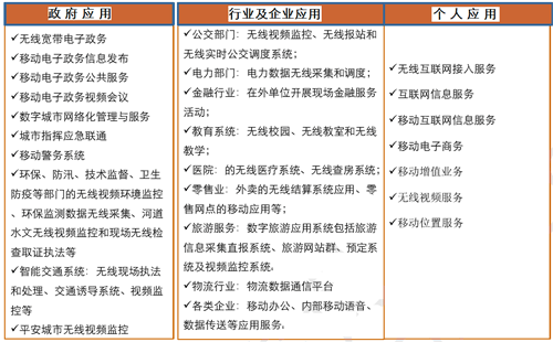 根据《2006-2020年国家信息化发展战略》,国家信息化服务领域主要包括文化、社会、政务和经济四大领域。在这些领域睛彩无线城市将发挥其无所不在的网络,无所不有的应用来服务于国计民生的方方面面。睛彩无线城市的服务对象主要包括政府部门、企事业单位和公众用户三类。针对用户类别,我们也可以将服务内容分为政府应用、行业及企业应用、个人应用三类,如图2。