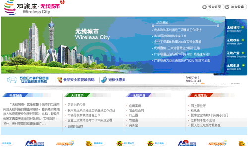 睛彩无线城市的用户可以使用手机、MID、平板电脑、CMMB手持电视等多种终端,通过3G、WiFi、CMMB等无线技术接入统一门户。睛彩无线城市门户网站是一个面向广大用户,具备Web、WAP访问方式,兼容CML推送和富媒体页面展示,提供睛彩无线城市相关的内容、应用和服务等。睛彩无线城市门户网站的建立对于其品牌宣传和业务推广、展示睛彩无线城市的各类应用、建立与用户互动沟通的平台有着重要意义,以此成为睛彩无线城市的电子渠道、业务平台和互动宣传窗口。石家庄已建成TD无线城市统一门户示例,如图3。