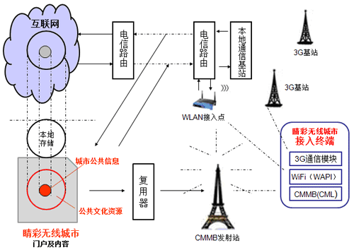 睛彩无线城市将无线通信技术和数字广播技术相结合,在网络层、业务层、应用层上相互交叉、优势互补,提供共性文化要普及、个性服务更便捷的门户和内容服务,利用数字广播技术一定程度转移了移动通信网和互联网日益加重的流量和能耗压力,创造了在技术体系、业务运营、用户服务诸多方面和谐融合发展的生态环境,实现了快捷、广泛、低碳的新型多媒体综合信息服务。