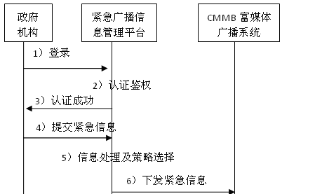 (6)紧急广播信息平台下发紧急信息给相应的富媒体广播系统;
