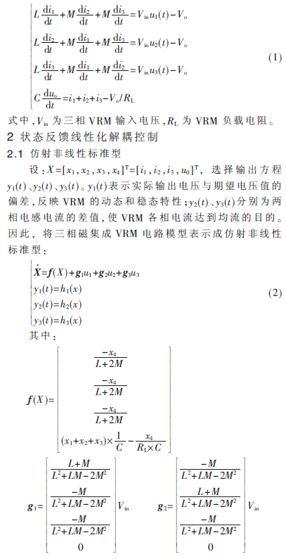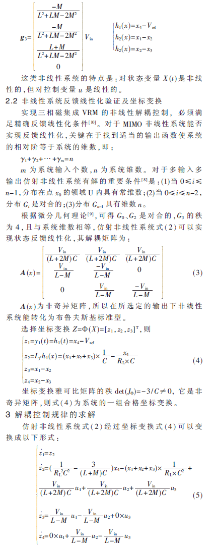 最近几年,有学者将精确反馈线性化控制引入到单通道buck变换器和两通道磁集成VRM中,取得了良好的效果[6-8]。参考文献[7]中,将微分几何理论引入到两相磁集成VRM中,在求解两相反馈线性化解耦策略过程中应用了具有二次型性能指标的线性最优控制设计方法。本文以三相磁集成非隔离式VRM为研究对象,将微分几何理论应用到三通道磁集成VRM中,首先建立三输入三输出仿射非线性模型,其次,基于微分几何理论推导出其精确反馈线性化控制规律,实现控制变量的解耦,最后给出了仿真结果。