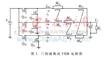 微处理器的快速发展对电压调节模块VRM(Voltage Regulator Model)的要求越来越高。根据Intel VRD11.1 标准,VRM的输出电压在0.5 V~1.6 V之间,输出电流达到180 A,而且对动态响应和稳态特性提出了严格的要求[1]。在实际应用中,传统VRM多采用多相并联交错同步整流技术来降低电流电压纹波和提高动态性能[2-3],但并不能降低各并联支路的电感电流纹波。因此,研究者一直致力于将多相电感集成应用到VRM中[4-5]。研究表明,集成磁件在多相并联交错VRM的应用可以使其稳态特性和动态响应都能得到很好地改善,但同时集成磁件之间的磁耦合使得VRM的控制变得复杂。