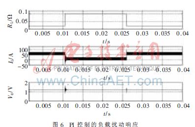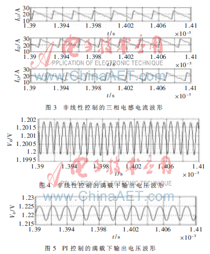图3、图4为三相磁集成VRM在精确反馈线性化控制策略下的稳态仿真波形。图3显示了稳态工作时,三相电感电流保持均流;图4中输出电压纹波为1.9 mV,图5中PI控制的输出电压纹波为6 mV,因此可以看出,精确反馈线性化控制能很好地改善系统的稳态特性。