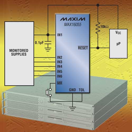 Maxim推出可监控6路电压的微处理器监控电路MAX16055,器件集成了复位定时器,无需外部电容。器件采用