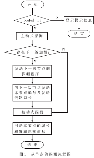 已被加载过的从节点首先采用主动式探测,如果发现有可用于加载的链路口,表示存在下一级加载,则采用和根节点相同的探测过程,并且在完成后再采取被动式探测,得到该节点的其它链路连接信息并回送到根节点;如果发现没有可用于加载的链路口,就采用被动式探测,得到该节点的其他链路连接信息并回送到根节点。该过程的流程图如图3所示。