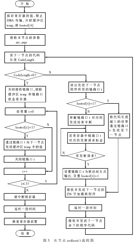 (4)读出发送下一节点程序所用的链路口t。如果booted[t]=1,将t从下一节点的加载路径信息中去掉,并将代码长度减去1,其余信息不变,然后将更新后的加载文件包发送到下一节点;如果booted[t]!=1,则屏蔽寄存器中链路口t对应的发送结束中断,然后读寄存器中链路口t对应的发送请求标志。当链路口t有发送请求时,设置链路口t为核访问方式输出,且置booted[t]=1。