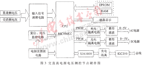 现场测控节点作为现场数据采集与控制层完成的功能包括:对各状态量的检测;对交直流叠加电源电压的控制,达到直流基压0~60kV,交流峰峰值电压40kV,交流频率16~50kHz;对进入反应器的烟气温度进行控制(60~80℃);对氨注入的控制,准确地控制氨硫摩尔比(不大于2:1)。各个现场测控节点具体的功能可能不一样,但硬件结构大同小异,下面以交直流叠加电源电压测控节点为例进行介绍,其硬件结构图如图3所示。该电路主要包括输入信号调理电路、单片机外围电路、模拟控制信号输出电路、液晶显示电路和CAN通信电路等。CPU采用Intel公司的16位单片机80C196KC作为微处理器,其内部设有256字节的RAM,带有28个中断源,运算速度快,它本身还带有三路PWM输出和高速输入输出HSI和HSO,尤其适用于快速控制系统。CAN总线通信电路采用Philips公司的SJA1000独立控制器和82C250驱动器。SJA1000有基本的Basic CAN和增强的Peli CAN两种模式,全面支持具有新功能的CAN2.0B协议[4]。82C250可以提供总线的差动发送和接收功能,提高系统总线的节点驱动能力,增大通信距离、降低干扰。控制单元采用高速光耦6N137隔离各个前后通道,被隔离部分分别使用不同的电源和地线,以提高抗干扰性能。