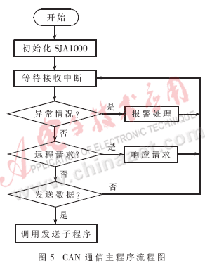 系统软件设计包括现场测控节点的数据采集与处理软件设计、CAN接口适配卡通信软件设计和上位机管理软件设计。上位机管理软件采用Visual C++编写,主要完成设备状态和工艺参数的数据采集;向测控节点发送请求修改控制参数;显示动态实时数据和历史曲线图;对历史数据进行保存和打印报表。现场测控节点软件采用80C196汇编语言编程,主要完成三项任务:一是检测系统各项物理参数以及设备的工作状态参数并传到CAN总线上,以监视系统运行状况和趋势;二是根据控制算法对相应的量进行实时控制;三是对异常状况的报警处理。CAN接口适配卡通信软件跟测控节点CAN通信软件基本相同。下面着重介绍CAN通信软件的设计。程序首先对SJA1000进行初始化,设置好工作模式、滤波功能、通信波特率和输出特性后,就处于接收中断中。在接收完毕后,对接收的信息进行处理,或响应远程帧,或调用发送子程序发送数据,或向上位机报警。在此期间若有错误发生,可以利用SJA1000方便的错误代码捕捉功能了解详细信息并启动错误处理机制。主程序流程图如图5所示。在整个通信软件设计中,SJA1000的初始化至关重要,直接关系到系统能否正常运行。其流程图如图6所示。注意,SJA1000有个测试寄存器(地址为0x09),可以通过写入并读它的数值来判断CPU与SJA1000的硬件连接是否正确。