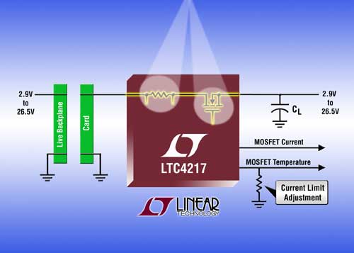 LTC4217 适合于多种 RAID、服务器、电信和工业应用,尤其在利用光纤通道等技术的紧凑型电路板上,由于这类电路板尺寸小以及不能消耗大量热量,因此功率一般限制到低于 25W。在设计 LTC4217 的热插拔工作和集成时考虑了这些因素。启动时,通过将栅极斜坡率限制到安全的 0.3V/ms来控制浪涌电流。利用在内部 7.5mΩ 检测电阻上检测到的电压以及相应调节内部 25mΩ MOSFET 栅源电压来监视负载电流。一个单独的 ISET 引脚允许在启动和正常工作时按需调节准确度为 2% (